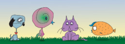 These vector-based characters were based on original sketches and use a simplistic style. Though they came from separate drawings, they were rendered to look like a unified set.